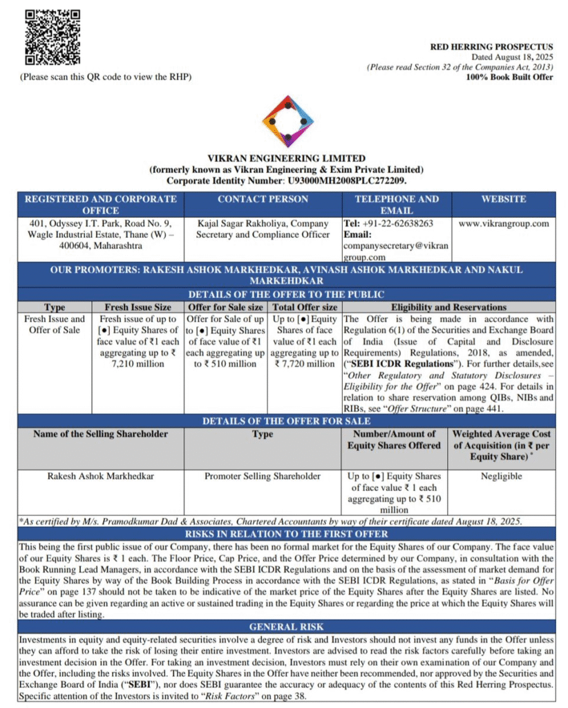 विक्रान इंजीनियरिंग का आईपीओ (IPO) 26 अगस्त 2025 को खुलेगा और 29 अगस्त 2025 को बंद होगा